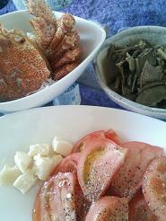 先日のおつまみ。ボイル毛蟹、牛筋と野菜の煮込み、トマトサラダ。