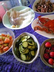 昨日のおつまみ。イカのお刺身、イカのわた焼き、蟹、トマトとアボカド・海老のエスニックサラダ、きゅうりのナムル風、さくらんぼ。でした。