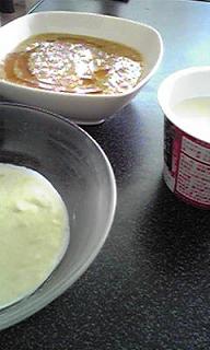母の日である本日、たーちゃんの朝食。黒ゴマトーストペースト、温泉卵、抹茶カステラのペースト。