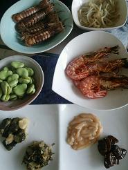 先日のおつまみ。しゃこ、もやしのスパイス和え、茹で空豆、海老の塩焼き、京都のお漬物、塩辛、はまぐりの佃煮。