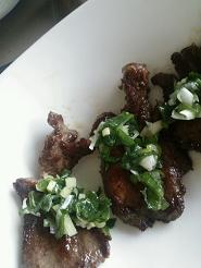 牛タンは赤ワインでフランベして、外はかりっ中はふわっ。塩・にんにく・ごま油で味付けしたねぎをたーっぷり乗せて。
